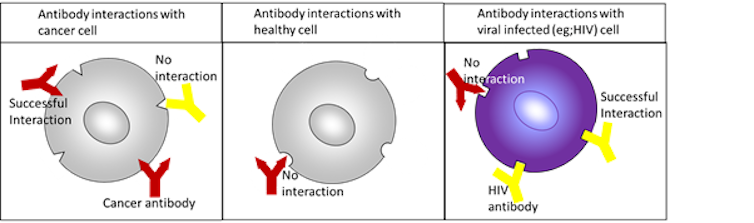 Antibodies are like puzzle pieces – and diseases are like an incomplete puzzle. Therefore, only antibodies with a specific shape will fit into the “cancer puzzle”. Antibodies with other shapes would fit other puzzles, but not cancer. The ability of antibodies to discriminate between different cells and diseases is the basis for antibody-based immunotherapies.
