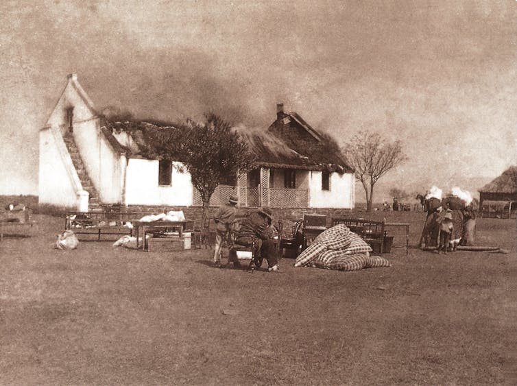 A Boer family looks on at their house that was set alight by the British forces during the South African War. Photographical Collection Anglo-Boer War Museum, Bloemfontein SA