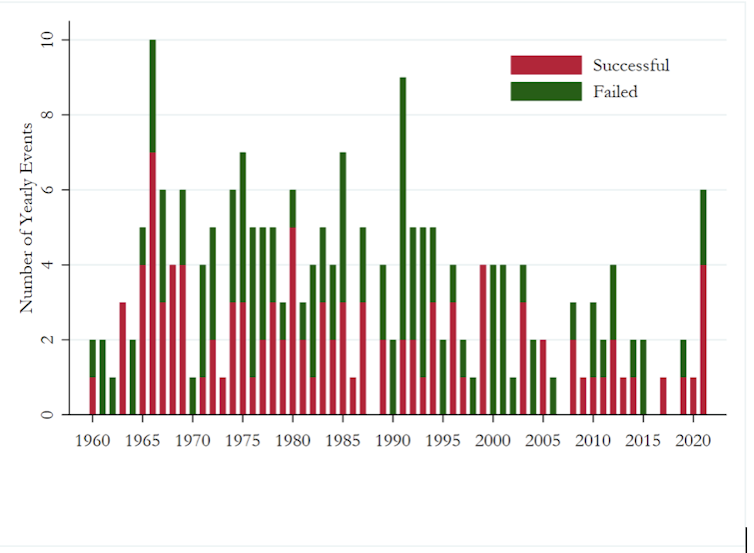 Not since 1999 had so many successful coups occurred in a calendar year and not since 1980 had there been a year with more successful coups. Though 2021 appeared exceptional, the coup in Burkina Faso could suggest 2021 was no fluke.