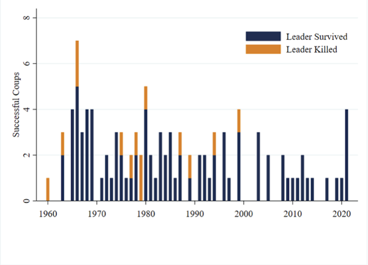 Compared to earlier eras, however, coups in the last 20 years have been comparatively tamer. It’s important to note that violence is a tool whose use all coup leaders accept. Nevertheless, the level of violence associated with them has dramatically decreased over time. This is not a coincidence . Leaders such as Sylvanus Olympioin 1963 , and Thomas Sankara in 1987 were not killed by accident. These were murder victims whose deaths were meant to facilitate a coup’s success and to eliminate a future political threat.