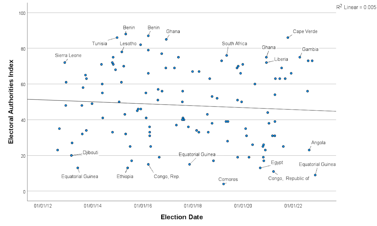 We also analysed election body autonomy data from the Varieties of Democracy (V-Dem) project. This is produced by an independent research institute at the University of Gothenburg, Sweden. Election body autonomy is a narrower measure compared to those in the Perceptions of Electoral Integrity dataset. However, it offers more granular insight into what has happened in 51 African countries since 2006.