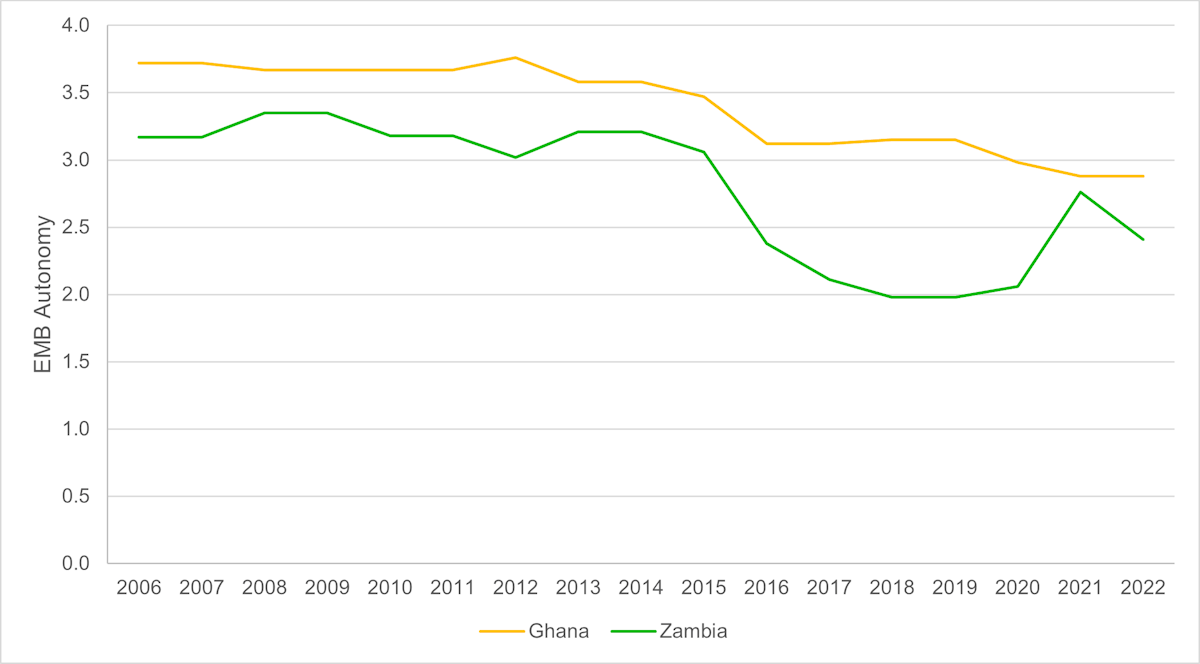 To investigate possible drivers of decline, we looked at Zambia and Ghana. These countries have a track record of peaceful elections. They have also had changes of power between different parties since the 1990s. However, the autonomy of their election bodies has declined over the last decade (Figure 2).