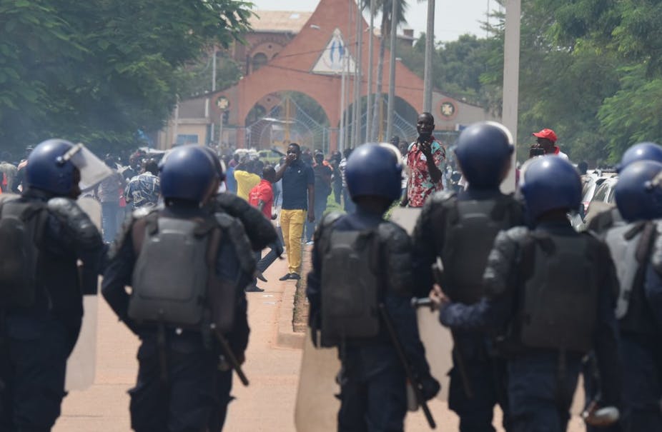 Riot police officers in front of demonstrators during a march in Ouagadougou in September 2019 called by the UAS union to call for better security measures against terrorism. Issouf Sanogo/AFP